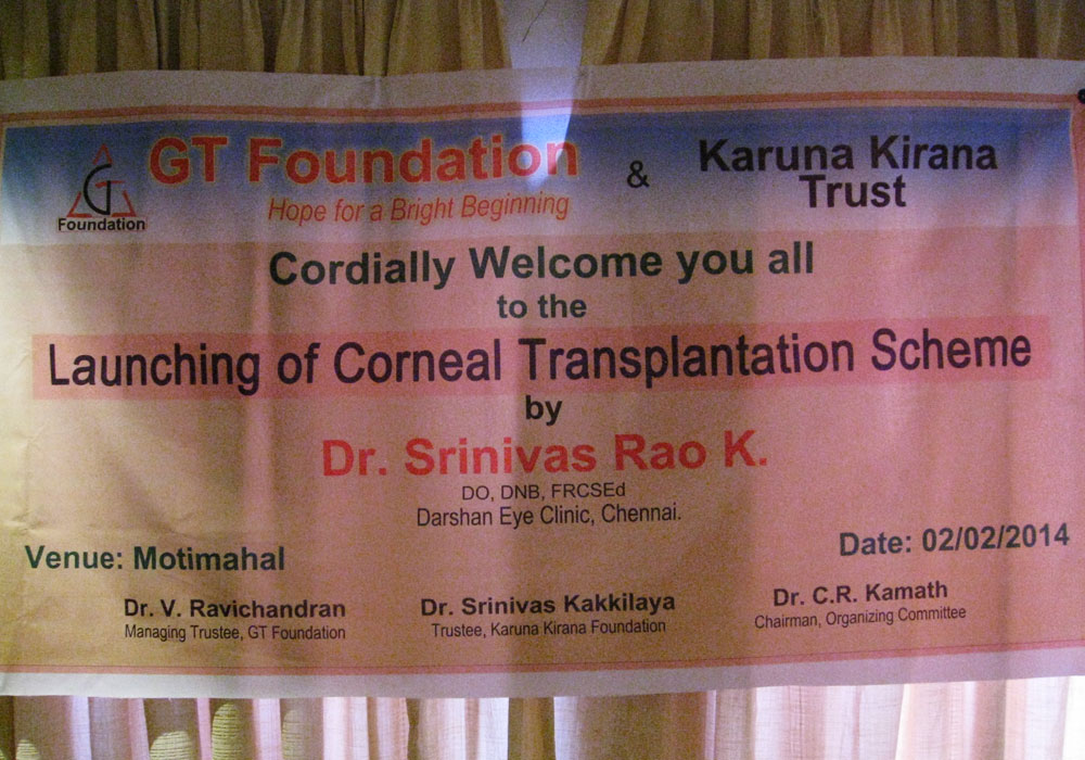 GT Foundation officially launched the Corneal Transplantation Scheme on February 2, 2014 at Hotel Moti Mahal, by Dr. Srinivas Rao K (famously known as Dr. SRK), an eminent Ophthalmologist from Chennai who is the founder of the Darshan Eye Clinic. The program was sponsored by the GT Foundation and organized by Dr. V. Ravichandran, Managing Trustee of GT Foundation and coordinated by Dr. C.R. Kamath, one of the renowned Ophthalmologists from Mangalore.